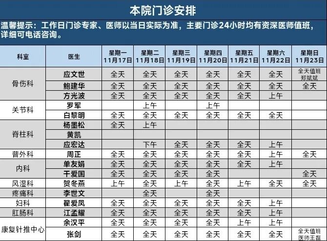 11月17日—11月23日本院門診安排表
