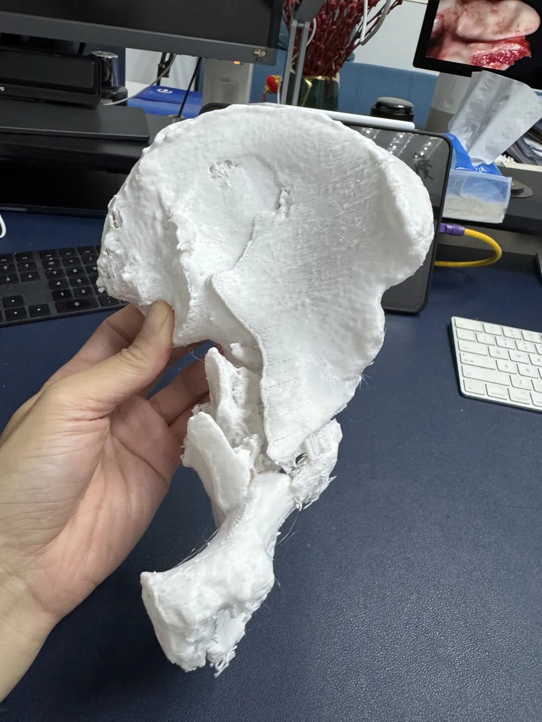 在腔靜脈濾器成功植入,患者安全度過血栓脫落風(fēng)險的高危期后,羅軍團(tuán)隊將利用先進(jìn)的3D打印技術(shù),為患者量身定制骨盆骨折修復(fù)方案?;诨颊逤T數(shù)據(jù)打印出的1:1精準(zhǔn)骨盆模型,能讓醫(yī)生在術(shù)前清晰掌握粉碎骨塊的形態(tài)、位置,實(shí)現(xiàn)極致的手術(shù)可視化和方案個性化,顯著提高手術(shù)精準(zhǔn)度、減少創(chuàng)傷、縮短手術(shù)時間,最終目的是促進(jìn)患者獲得最佳的功能恢復(fù)。