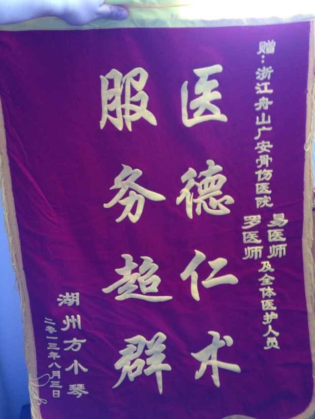 今年8月,時隔手術(shù)時間已經(jīng)一年了,方女士千里迢迢從湖州再次趕來我院,為的只是進行內(nèi)固定拆除術(shù)。其實拆除手術(shù),是一個很簡單的手術(shù),在普通醫(yī)院都能完成。可出于對我院的信任和感激,方女士特地讓兒子開車從湖州趕到舟山。手術(shù)結(jié)束后,方女士顯得激動萬分。她說:感謝廣安醫(yī)院醫(yī)生護士的高超技術(shù)以及細心照顧,讓我的腿恢復(fù)的這么好。雖然湖州離舟山要好幾個小時的車程,可是我不覺得辛苦,因為我知道這里有最好的醫(yī)生護士等著我,我對他們的技術(shù)與服務(wù)感到非常的放心。這面錦旗不值錢,可卻代表了我對廣安醫(yī)院的感激之情。