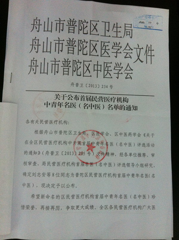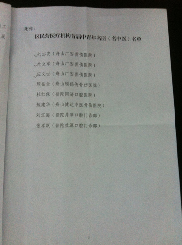 近日普陀區(qū)衛(wèi)生局民營醫(yī)療機構(gòu)首屆名醫(yī)(名中醫(yī))評選活動圓滿結(jié)束。我院劉志安、危立軍、應(yīng)文世被評為區(qū)民營醫(yī)療機構(gòu)首屆中青年名醫(yī)(名中醫(yī))。