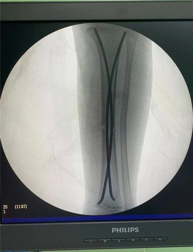 據(jù)羅主任介紹,兒童骨折絕不是成人骨折的縮小版。兒童的不穩(wěn)定性脛骨骨折或雙側(cè)脛骨骨折,保守治療很難達(dá)到理想復(fù)位,可能會(huì)造成肢體不等長(zhǎng)、成角旋轉(zhuǎn)畸形、肌肉萎縮等并發(fā)癥。而彈性髓內(nèi)釘?shù)膽?yīng)用,正好解決了患者和醫(yī)生所擔(dān)心的問題,既理想地固定了骨折,又不影響肢體美觀,可謂一舉兩得。“彈性髓內(nèi)釘”技術(shù)可在保護(hù)骺板不受損傷的前提下,利用多點(diǎn)固定的原理,微創(chuàng)、有效地治療3—15歲的四肢長(zhǎng)骨骨折患兒。手術(shù)在C型臂全程引導(dǎo)下,只需在骨折遠(yuǎn)、近端各切一2—3cm切口打入彈性髓內(nèi)釘,創(chuàng)傷極小,不影響孩子的骨骼發(fā)育,對(duì)于骨折的愈合以及孩子以后骨骼發(fā)育影響小。相比之下,既有效避免了切開復(fù)位鋼板內(nèi)固定創(chuàng)傷大、疤痕大等缺點(diǎn),又有效避免了支架外固定鋼針外露、不易護(hù)理等弊端。