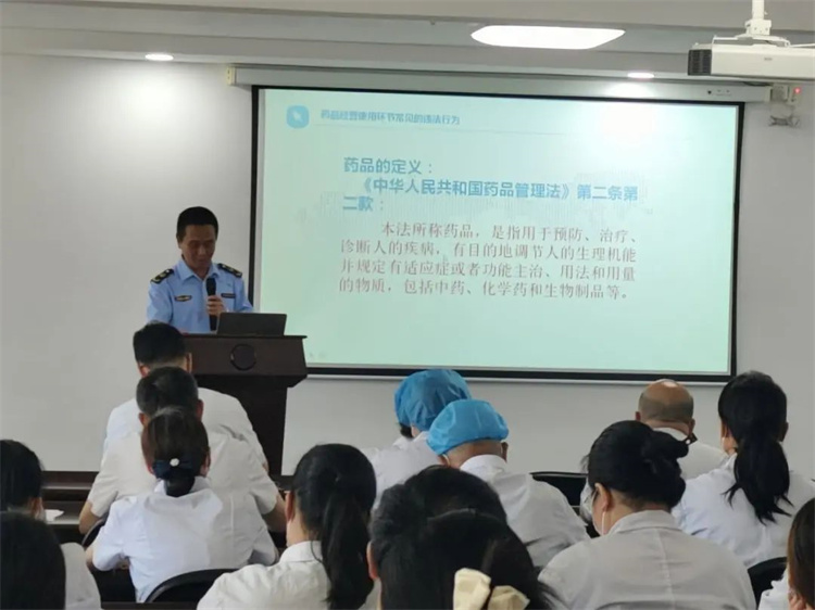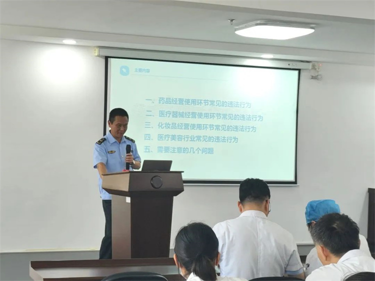 為進一步增強我院藥品、醫(yī)療器械和化妝品的日常管理工作,使醫(yī)院職工充分了解相關(guān)法律法規(guī)知識。8月10日(周四)下午,我院在四樓會議室召開藥品、醫(yī)療器械和化妝品的日常管理和相關(guān)法規(guī)業(yè)務(wù)培訓(xùn),邀請舟山市市場監(jiān)督管理局張海軍老師進行授課,我院各科室負責(zé)人及相關(guān)骨干人員參加了培訓(xùn)。