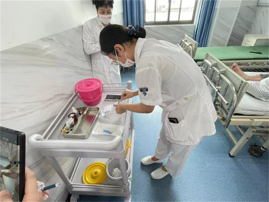 按照比賽要求,評委通過病房隨機選中病人,24名崗位標(biāo)兵從用物準(zhǔn)備、操作技能、靜脈穿刺情況再到終末處理,全流程展示精準(zhǔn)的服務(wù)規(guī)范和高超的臨床技能。整個比賽過程,不僅是對護理人員技能水平的考驗,更是對護理人員的溝通能力、應(yīng)變處置能力、評判思維等進行了綜合考核。
