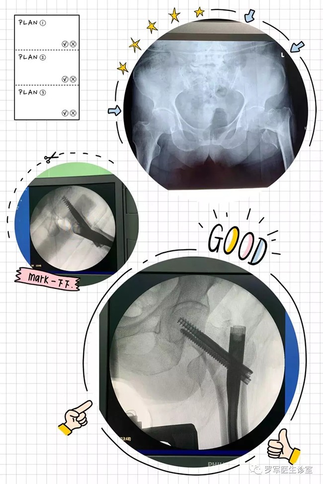5月7日,羅軍主任帶領(lǐng)手術(shù)團隊按照術(shù)前的討論方案,在C臂機透視下,采用三個微創(chuàng)手術(shù)通道,施行精準(zhǔn)閉合復(fù)位、定位、固定,僅用了大約30分鐘,便成功完成微創(chuàng)內(nèi)固定手術(shù)。手術(shù)進行順利,第二天老人就可以在床邊坐起了。老奶奶非常開心,叫家人一定要送面錦旗給醫(yī)生。