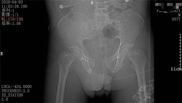 內(nèi)科繼續(xù)加強補液、輸血及升壓藥物應用,穩(wěn)定患者生命體征。超聲科在經(jīng)過床邊檢查后,發(fā)現(xiàn)患者膀胱內(nèi)積血、肝脾未破裂,腹腔積血為血腫形成,暫不考慮開腹探查。普外科周正主任分析病情后考慮病人存在膀胱損傷,立即對其進行導尿,保證尿液引流通暢,促進膀胱功能恢復。骨科醫(yī)生立即對患者進行骨盆外固定帶固定骨折部位,牽引復位,以避免骨折端進一步錯位導致二次損傷。