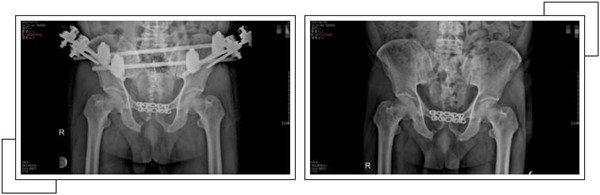 二周后,趙大叔病情穩(wěn)定,身體各方面條件符合手術指征后,骨科中心副主任羅軍帶領手術團隊為其進行了骨盆骨折、恥骨聯(lián)合分離、雙側(cè)髂骨骨折、右側(cè)恥骨上下支骨折切開復位內(nèi)外固定術,手術一個半小時順利完成。