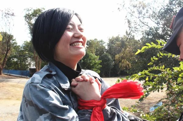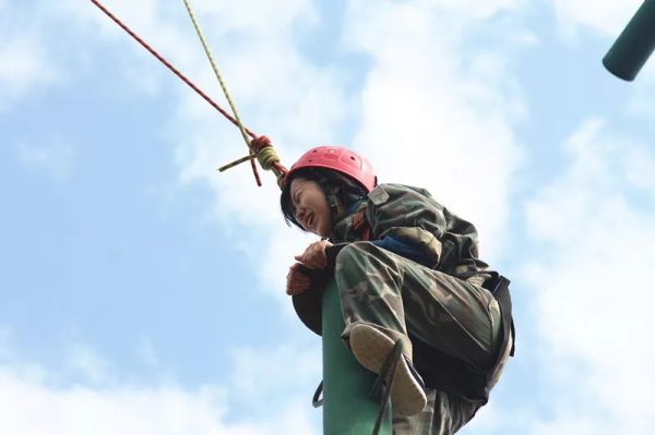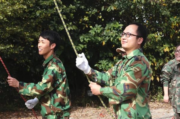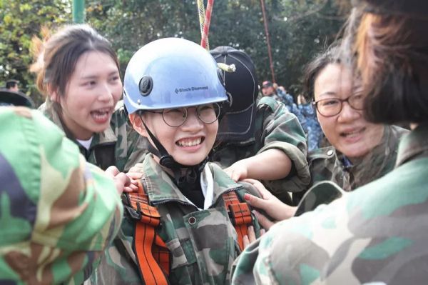 當(dāng)隊(duì)員雙手內(nèi)翻并用繩子栓緊內(nèi)扣,倒數(shù)一二三倒在其他隊(duì)員搭建的手臂上時,大家一起用堅(jiān)實(shí)有力的臂膀托住隊(duì)友,成功的喜悅都在大家的笑聲里。
