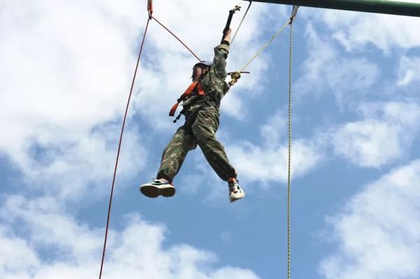 在教練員的簡單示范后,一名隊(duì)員穿上全身式安全帶、戴上安全頭盔、鐵扣掛住主繩,在全體隊(duì)員的加油聲中勇往直前,爬上鐵柱桿子,在最高點(diǎn)跳向掛在高空的單杠。而其他隊(duì)員正認(rèn)真又緊張的拉住保護(hù)繩,給隊(duì)友百分百的安全保障。